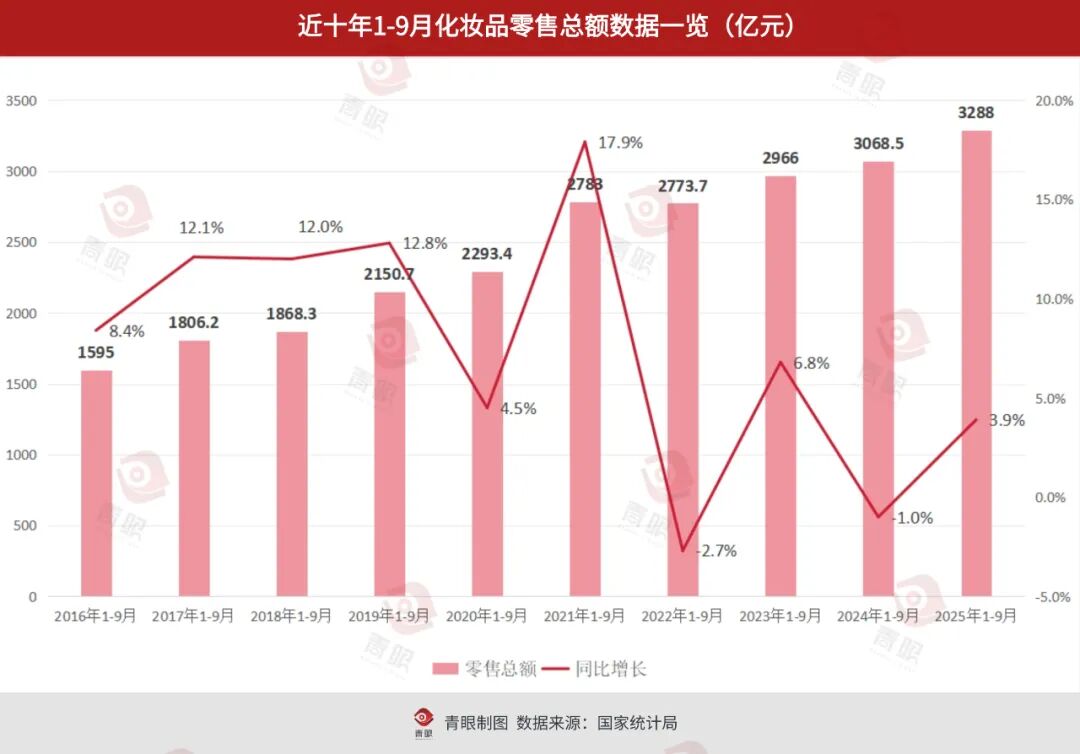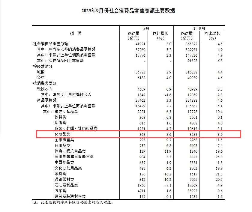 随着9月数据的发布,今年前三季度化妆品零售总额的数据也随之出炉。根据国家统计局数据显示,今年1-9月,化妆品零售额为3288亿元,同比增长了3.9个百分点。