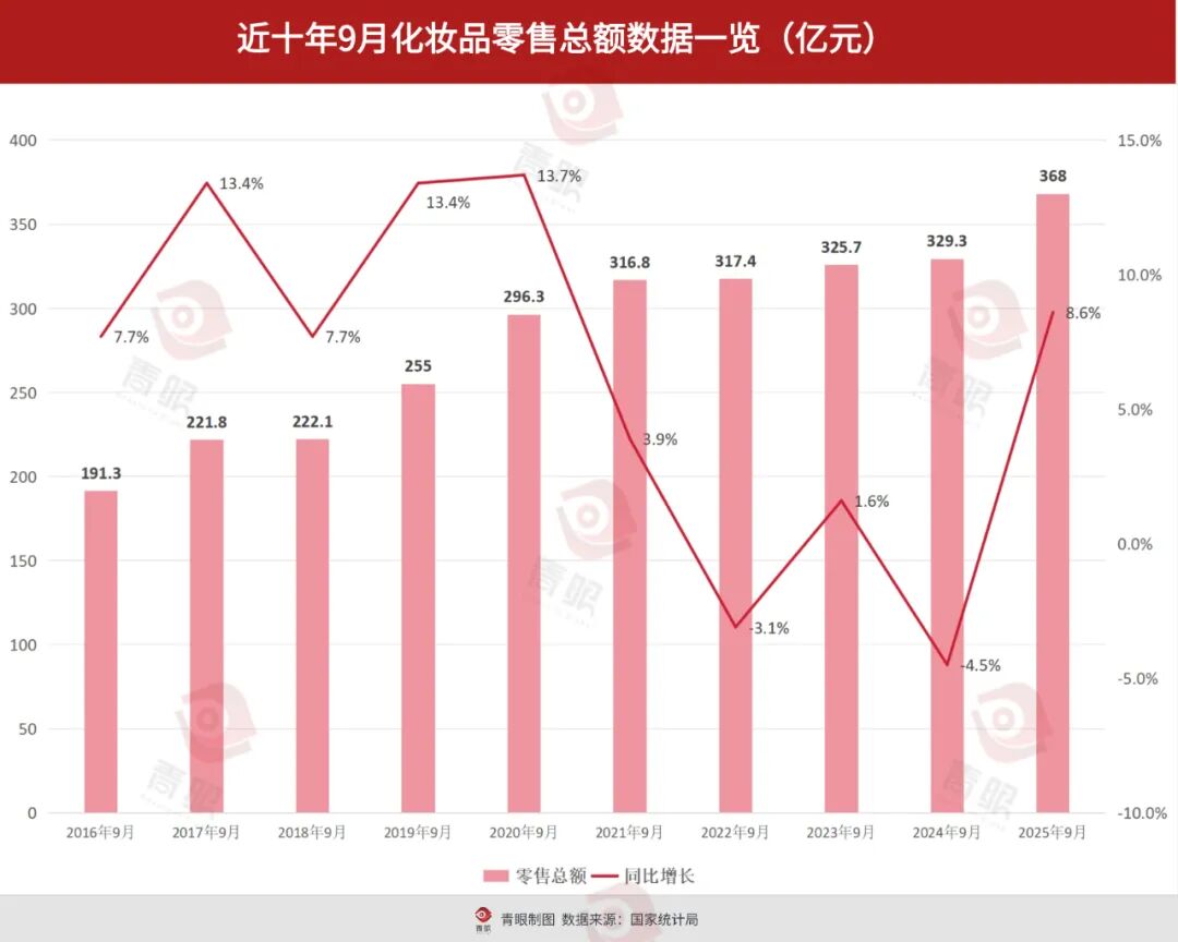 10月20日,国家统计局发布最新数据显示,今年9月,化妆品类零售额为368亿元,同比上涨8.6%,是今年以来增幅最高的月份。
